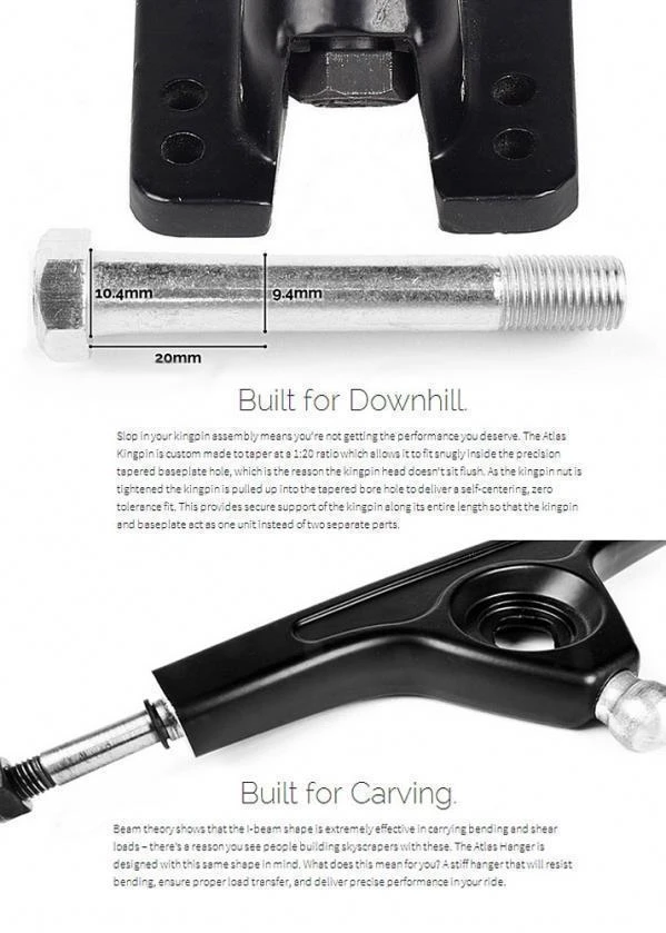 Die ATLAS TRUCKS sind die neuen Carving Trucks auf dem deutschen Markt. Gebaut um die das Surffeeling auf die Straße zuholen. Das massive Kugel-Gelenk erlaubt den Hänger einem vollen uneingeschränkten Bewegungsumfang und lindert Pivot verschleiß. Der Achsstift ist von am Hänger für ein kleines Stück 10mm geht aber nach 2mm auf 8mm runter, bietet eine extrem steife & dauerhafte Achse mit dem zusätzlichen Vorteil eines integrierten Speed-Ring. Die maßgeschneiderte kegeliger Kingpin sitzt in einer bearbeitete Grundplatte bietet eine einzigartige, bequeme Passform. Sogar der Pivot-Cup bietet nächste Level Funktionen wie Gewinde Luftspalt zur einfachen Entnahme und Wartung.
