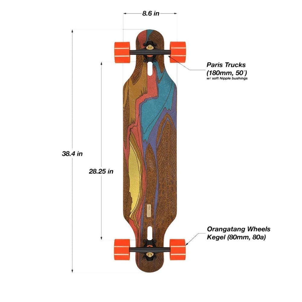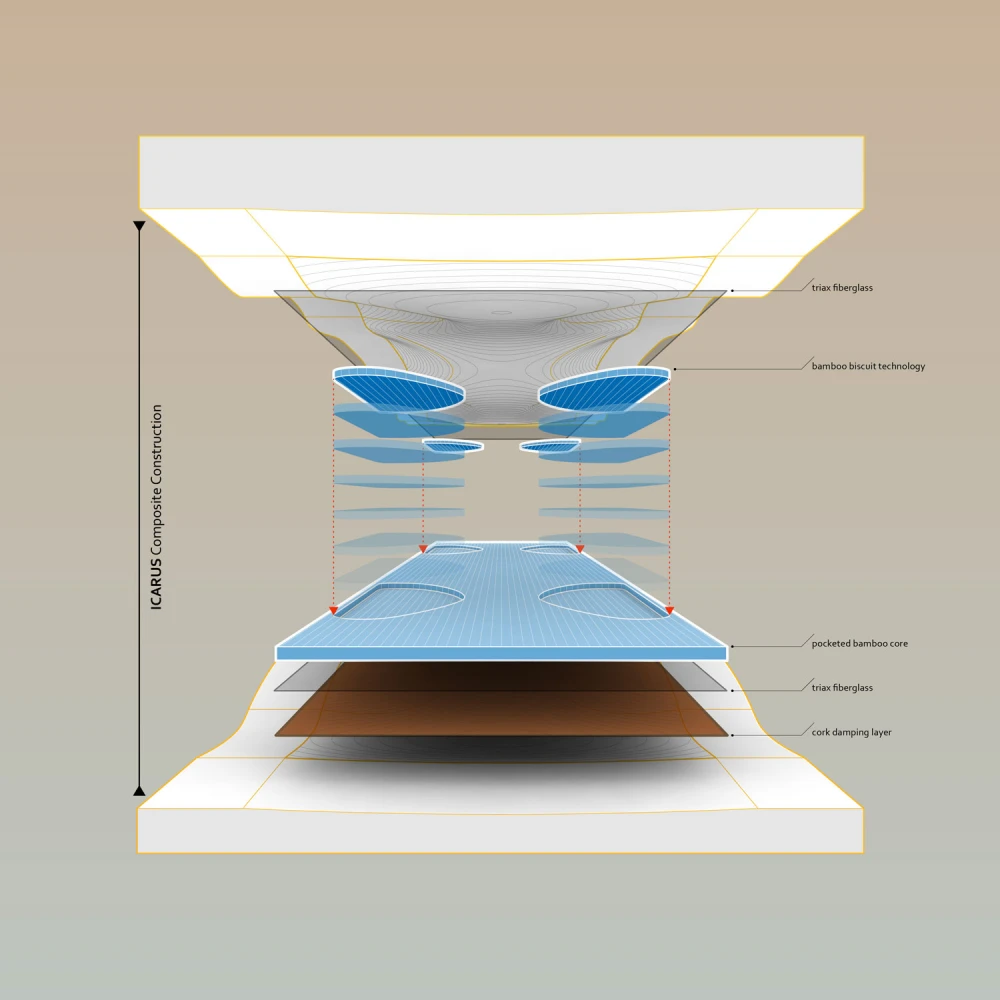 Die Kombination von vertikal laminiertem Bambuss, Glasfaser und der Korkschicht an der Unterseite sorgen für einen lebhaftes und reaktives Fahrgefühl bei gleichzeitig extrem guter Dämpfung. Durch die verschieden stark ausgeprägte Concave und der speziellen Form des Decks spürt der Rider mehr als zuvor vion seinem Board und die