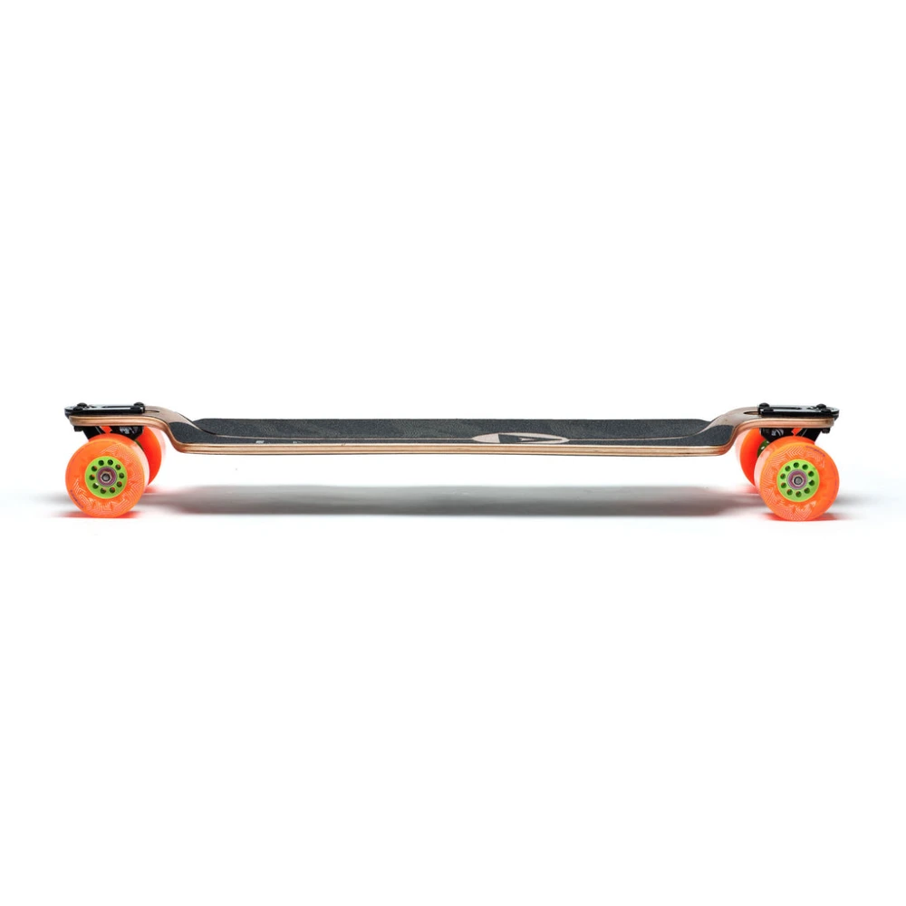 Dank der gedropten Bauweise ist der Schwerpunkt wesentlich tiefer und dank des kohlefaserverstärkten und somit festen Aufbaus ist das pushen super easy und lange Distanzen ein Kinderspiel. Der Drop sorgt ebenfalls für einfaches Einleiten von Slides zum Geschwindigkeitsregulierung beim Downhill.