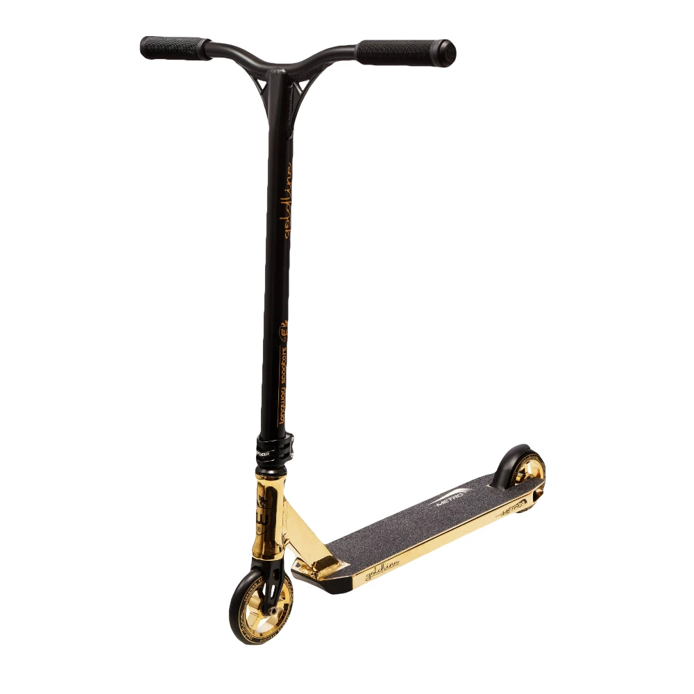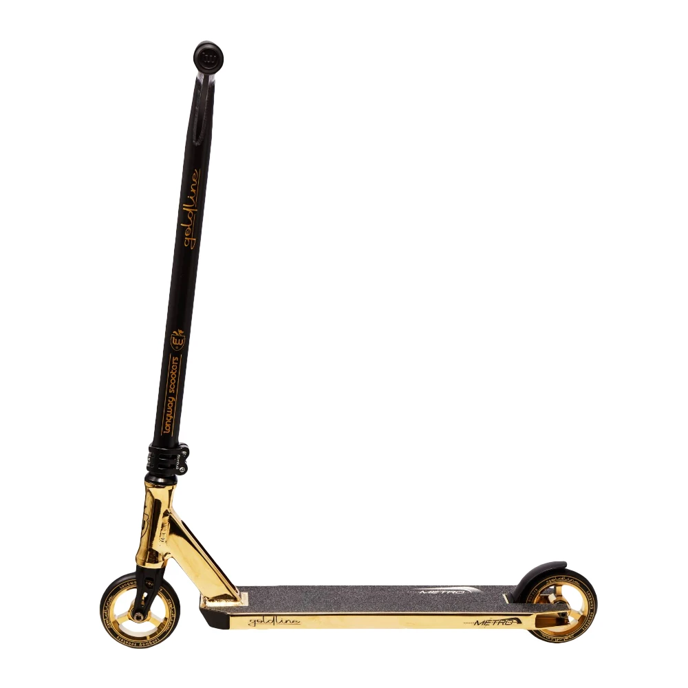 Der Metro-Scooter ist die logische Entscheidung, wenn du nicht mehr Tretroller fahren möchtest, sondern endlich coole Stunts ziehen willst. Durch eine Bauweise mit leichtem und hochwertigem Aluminium kannst du sehr leicht Tricks lernen. Dadurch wird deine Performance nicht durch unnötiges Gewicht eingeschränkt wird. Das Goldlinedesign verpasst dir dann die perfekte Combo aus Style und Performance.