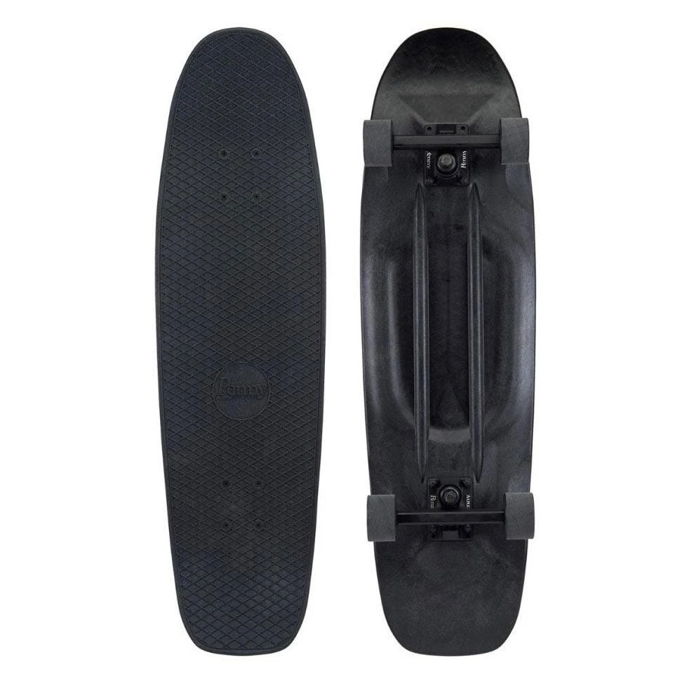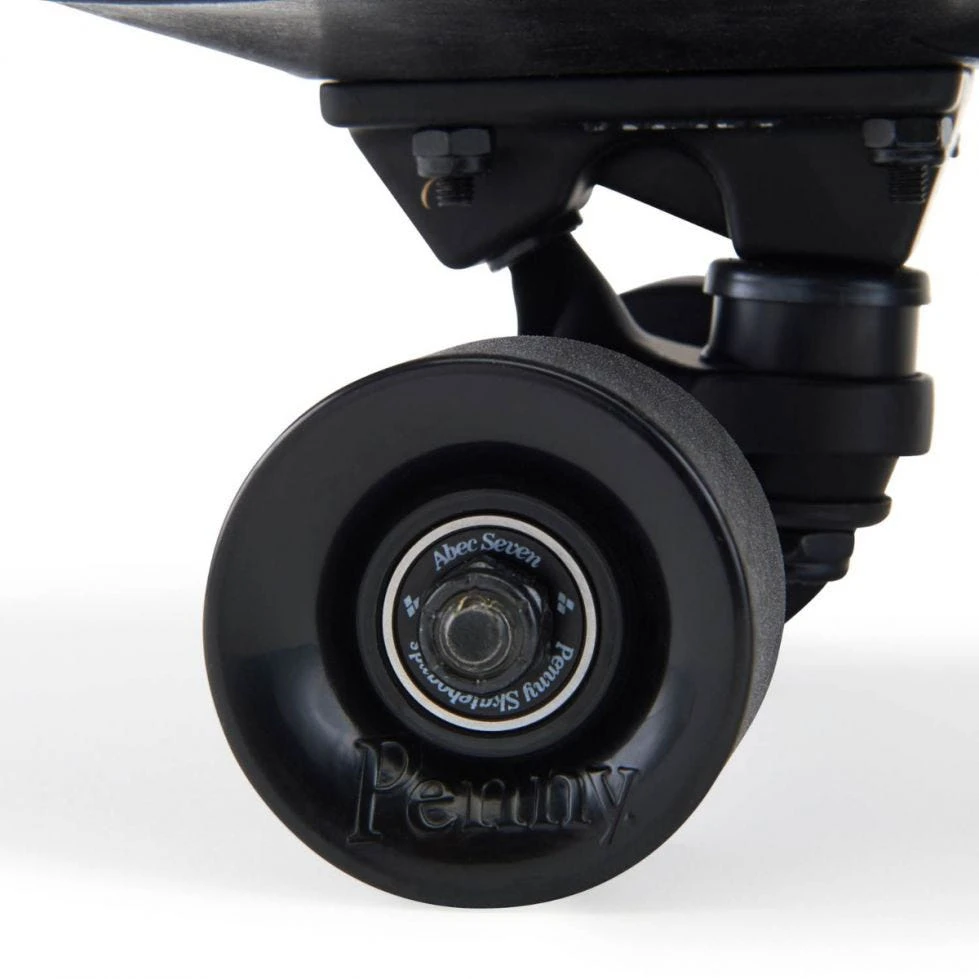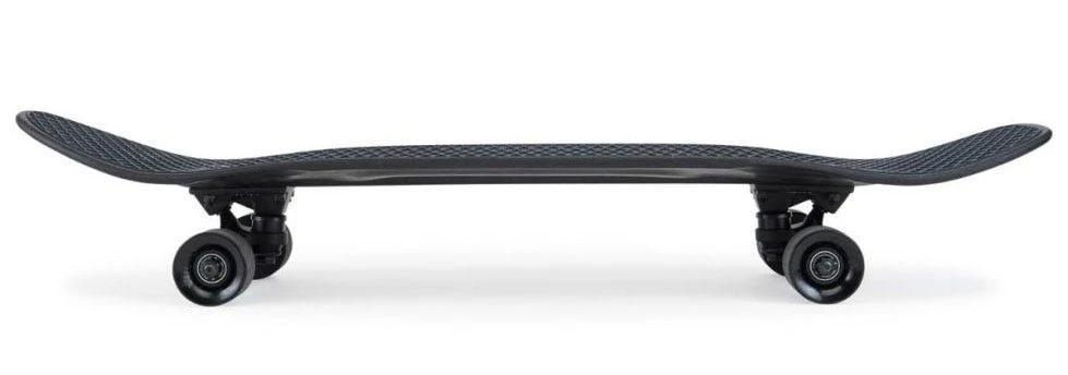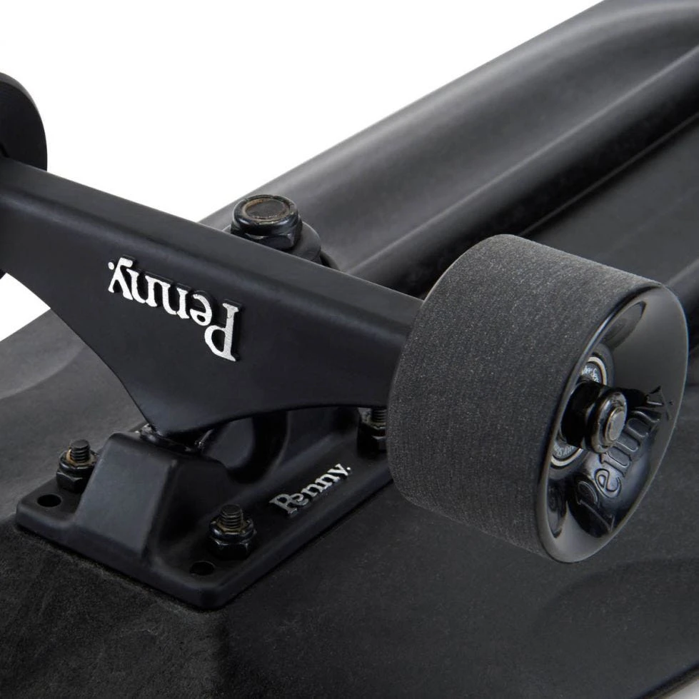 Das Penny Blackout kommt mit einem extrem vielseitigen Shape daher, der an die goldenen Zeiten des Bowlsurfens erinnert. leichte Kicks am Nose und am Tail ermöglichen Ollies und Slappy Grinds. Das Deck bringt dank der geheimen Zusammensetzung aus Kunststoff und Fiberglas angenehmen Flex.